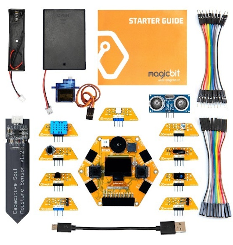 - Package contains Magcibit core board, Activity guide book, 10 plug and play modules, Battery Holder & USB cable